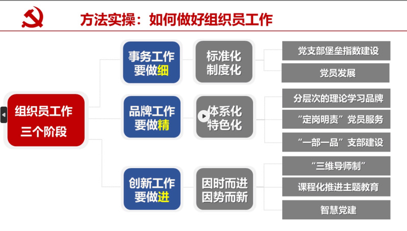 做好组织员工作,同时也是在加强做好党建工作,这不是一个人的工作,是组织上、单位的一个统筹工作。在干中学,在学中干,总结、凝练特色。